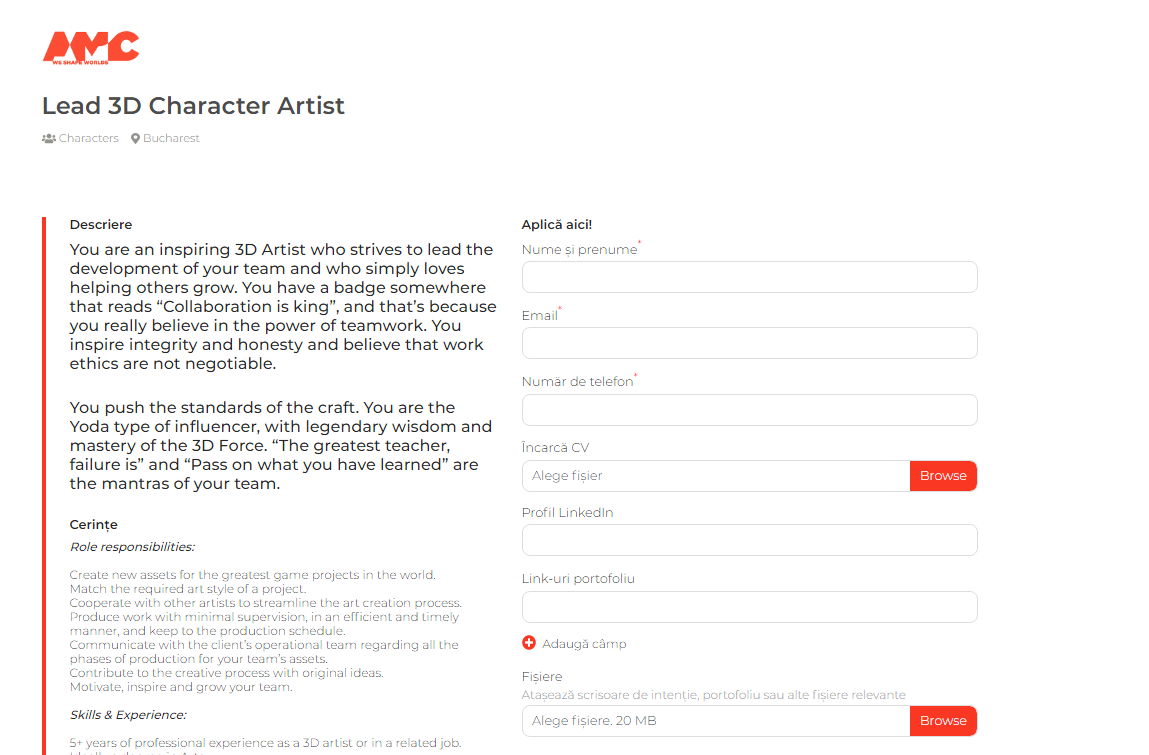 De peste de 20 de ani, AMC creează proiecte inovatoare de artă 3D în industria jocurilor, modelând întregi universuri digitale pornind de la un singur pixel. Toate aceste lucruri nu ar fi posibile fără priceperea, pasiunea și experiența echipei sale, formată din profesioniști talentați. Cele mai bune proiecte au nevoie de cei mai buni artiști, astfel că noii colegi sunt aleși cu grijă în urma unui proces atent de selecție.„Pe partea de recrutare colaborez foarte mult cu restul echipei”, spune Laura Aldica, Growing People Specialist. „Comunic frecvent cu colegii mei pentru a trece prin candidați și a-i evalua, iar pentru asta trebuie să ținem la un loc informațiile privind rezultatele la teste, portofoliile lor sau feedbackul echipei.”