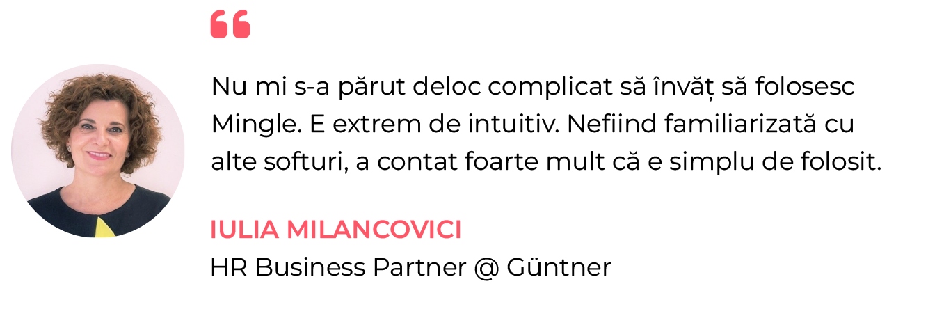 Când Gabriela Călin s-a alăturat echipei ca HR Manager, și-a dat seama că munca de recrutare poate fi simplificată cu ajutorul unui software. Atunci a descoperit Mingle și l-a propus echipei, care a fost încântată de soft pentru că era prietenos și ușor de folosit.